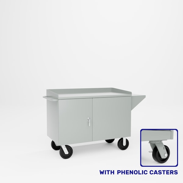 All welded steel, Heavy Duity Mobile Tool Cabinet Bench is furnished with acylin Der locking 9 drawer tool cabinet for parts storage. Back and endstopsprevent parts from falling off work area. Equipped with vise shelf and door with keyed handle. Overall dimensions 63in W x 40-1/4in H. Bench dimensions48in W x 37-1/4in H x 26in D. Includes 2 swivel & 2 rigid 8in x 2in Phenolic casters. Capacity 2,000 lbs. Powder Coat finish. GRAY.