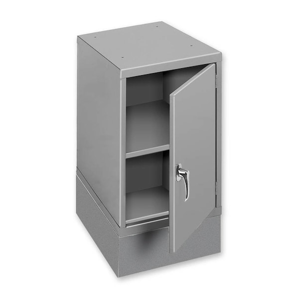 All welded steel, Heavy Duty Door Cabinet with Base. . 18in W x 24in D x 32in H. This 18 gauge door cabinet includes one adjustable shelf on 4in centers, keyed handle. Powder Coat finish. GRAY.