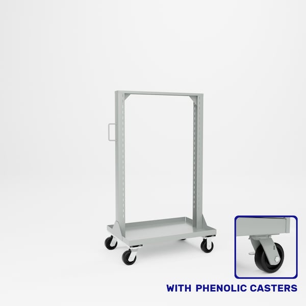 All welded steel, Heavy Duty Portable Bin & Shelf Cart. A perfect complement to any of our Pucel work stations. The convenience of a double sided cart allows everything for the job on one unit. Unit is an open frame construction that can be easily furnished with shelves, louvered or pegboard panels, and plastic bins. 2 rigid, 2 swivel 5in x 2in phenolic casters. Capacity 2,000 lbs. Dimensions 36in W x 24in D x 61in H. Powder Coat finish..