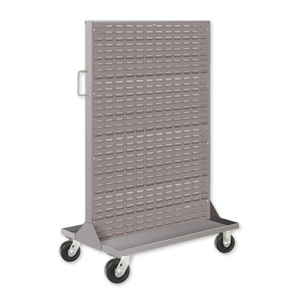 All welded steel, Heavy Duty Portable Bin & Shelf Cart with 2 Louvered Panels. Pegboard panel includes 1/4in holes on 1in centers. A perfect complement to any of our Pucel work stations. The convenience of a double sided cart allows everything for the job on one unit. Unit is an open frame construction that can be easily furnished with shelves, louvered or pegboard panels, and plastic bins. 2 rigid, 2 swivel 5in x 2in phenolic casters. Capacity 2,000 lbs. Dimensions 36in W x 24in D x 61in H. Powder Coat finish..