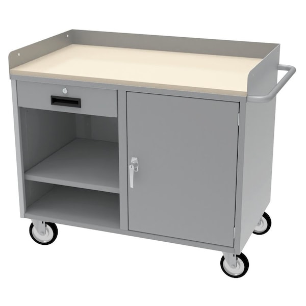 All welded steel, Heavy Duty Mobile Cabinet Workbench with One Door & One Drawer. Top surface with 3in H back & endstops. 3/4in composite top added to steel top. Adjustable shelves in door cabinet section. Locking handle on doors. Drawer with telescoping ball bearing slides and cylin Der lock. Drawer size 17-1/4in W x 22-3/4in D x 4-1/4in H. Capacity for drawer 100 lbs. Capacity for unit 1,000 lbs. 2 rigid, 2 swivel 5in x 1-1/4in polyurethane casters. Dimensions 42in W x 24in D x 34in H. Powder Coat finish..