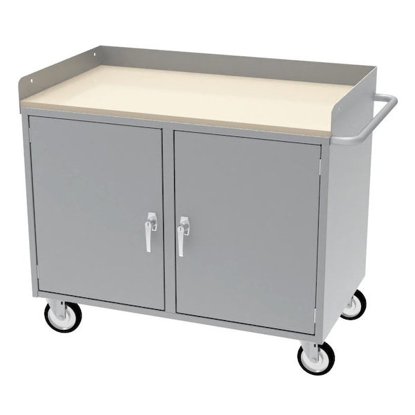 All welded steel, Heavy Duty Mobile Cabinet Workbench with Two Doors.. Top surface with 3in H back & endstops. 3/4in composite top added to steel top. Adjustable shelves in door cabinet section. Locking handle on doors. 2 rigid, 2 swivel 5in x 1-1/4in polyurethane casters. Capacity 1,000 lbs. Dimensions 42in W x 24in D x 34in H. Powder Coat finish..