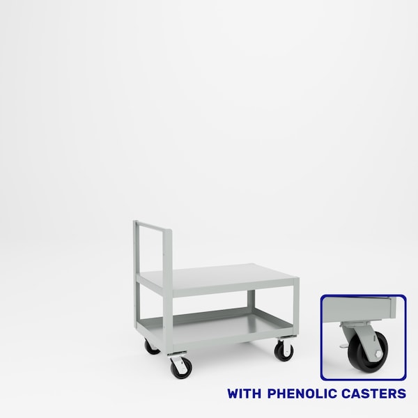 All welded steel, Heavy Duty Single Push Handle Truck. Designed for stock and general shop use. Includes 2 shelves. Flat top shelf and tray bottom shelf. 2 rigid, 2 swivel 5in x 2in phenolic casters. Dimensions 36in W x 24in D x 36inOAH, 22in H to top shelf. Capacity 2,000 lbs. Powder Coat finish..
