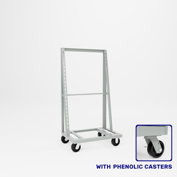 All welded steel, Heavy Duty Single Sided A-Frame Truck. Angle iron frame and uprights provide a stable platform for components. Holds a variety of optional trays, hanger bars, spin Dles and brackets. 2 swivel, 2 rigid 6in x 2in phenolic casters. Capacity 2,500 lbs. Dimensions 35in W x 25in D x 65-1/2in H. Powder Coat finish. GRAY.
