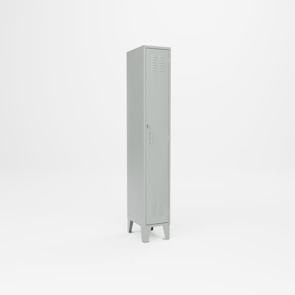 All welded steel, Heavy Duty Single Tier Locker. Fullyassembled. Includes one shelf 10in from top, a coat rod, 1 two prong hook and 2 one prong coat hooks. Louvers on door for ventilation. Holes in sides for bolting multiple units together. Door includes padlock loop with chrome pull handle. Dimensions 12in W x 18in D x 72in H (overall height 78in H on 6in legs). Powder Coat finish.