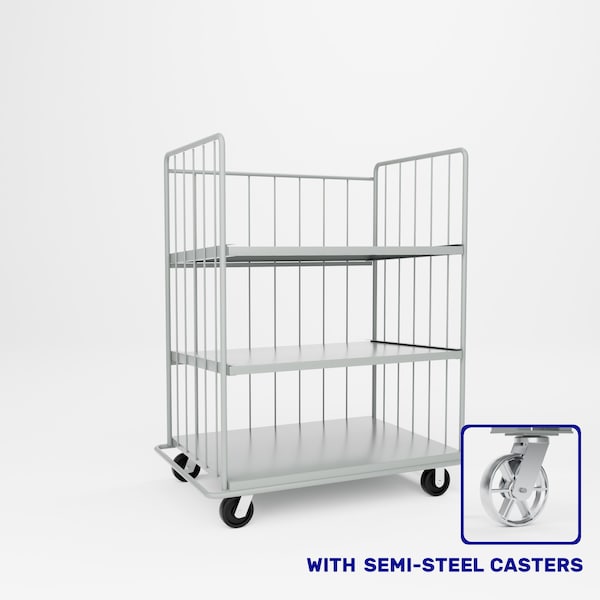 All welded steel, Heavy Duty Sliding Shelf Truck with See-Thru Design for visual load inspection. Shelves are easily removed by sliding out of channels, permitting truck to be used for large bulky materials. Consists of two sliding shelves and one fixed bottom shelf. Shelf clearance of 18in and 2in slope to the rear. 2 swivel, 2 rigid 6in x 2in semi-steel casters. Capacity 2,000 lbs. Dimensions 56in W x 37in D x 66in H. Powder Coat finish..