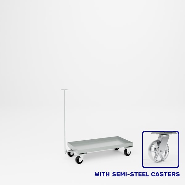 All welded steel, Heavy Duty Dolly. 12 gauge steel. 2in D tray style shelf. Floor clearance 5in H. Unit is equipped with a 36-1/2in long removable handle. 2 swivel, 2 rigid 4in x 2in semi-steel casters. Capacity 1,000 lbs. Dimensions 36in W x 18in D x 5in H floor clearance. Powder Coat finish.