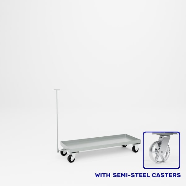 All welded steel, Heavy Duty Dolly. 12 gauge steel. 2in D tray style shelf. Floor clearance 5in H. Unit is equipped with a 36-1/2in long removable handle. 2 swivel, 2 rigid 4in x 2in semi-steel casters. Capacity 1,000 lbs. Dimensions 48in W x 18in D x 5in H floor clearance. Powder Coat finish.