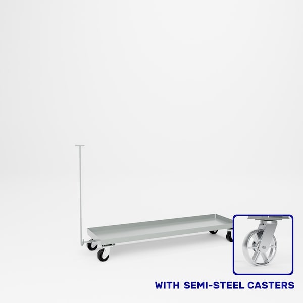 All welded steel, Heavy Duty Dolly. 12 gauge steel. 2in D tray style shelf. Floor clearance 5in H. Unit is equipped with a 36-1/2in long removable handle. 2 swivel, 2 rigid 4in x 2in semi-steel casters. Capacity 1,000 lbs. Dimensions 60in W x 18in D x 5in H floor clearance. Powder Coat finish.
