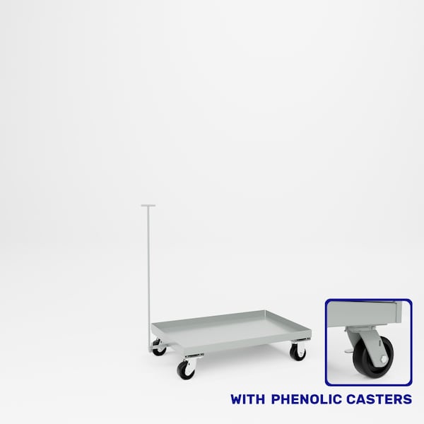 All welded steel, Heavy Duty Dolly. 12 gauge steel. 2in D tray style shelf. Floor clearance 5in H. Unit is equipped with a 36-1/2in long removable handle. 2 swivel, 2 rigid 4in x 2in phenolic casters. Capacity 1,000 lbs. Dimensions 36in W x 24in D x 5in H floor clearance. Powder Coat finish.