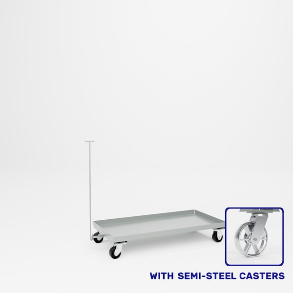 All welded steel, Heavy Duty Dolly. 12 gauge steel. 2in D tray style shelf. Floor clearance 5in H. Unit is equipped with a 36-1/2in long removable handle. 2 swivel, 2 rigid 4in x 2in semi-steel casters. Capacity 1,000 lbs. Dimensions 48in W x 24in D x 5in H floor clearance. Powder Coat finish.