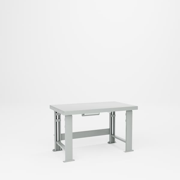 All welded, Heavy Duty Steel Top Hydraulic Work Bench. This ergonomic hydraulic bench allows an operator to adjust their work surface to accommodate a specific height with ease. This electric unit can adjust height up to 12in with the push of a button. Bench Dimensions 48in W x 28in D x 29in H to 41in H. Capacity 1,000 lbs. Powder Coat finish. Black.