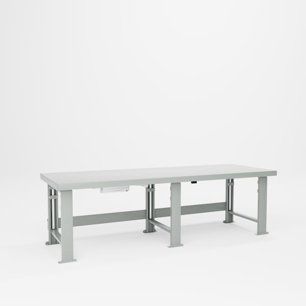All welded, Heavy Duty Steel Top Hydraulic Work Bench. This ergonomic hydraulic bench allows an operator to adjust their work surface to accommodate a specific height with ease. This electric unit can adjust height up to 12in with the push of a button. Bench Dimensions 96in W x 34in D x 29in H to 41in H. Capacity 1,000 lbs. Powder Coat finish. Black.