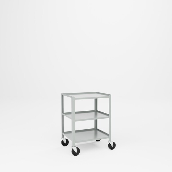 All welded steel, Heavy Duty Utility Cart with 3 Shelves. Includes back & side stops on shelves to prevent parts and other items from rolling off. 4-swivel 5in Casters. 25in W x 19in D x 34in H.Capacity 300 lbs. Powder Coat finish. GRAY.