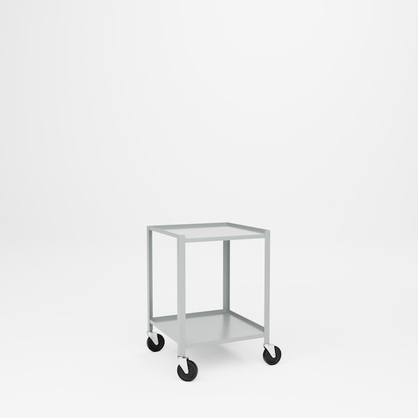 All welded steel, Heavy Duty Utility Cart with 2 Shelves. Includes back & side stops on shelves to prevent parts and other items from rolling off. 4-swivel 5in Casters. 24in W x 23in D x 34in H.Capacity 300 lbs. Powder Coat finish. GRAY.