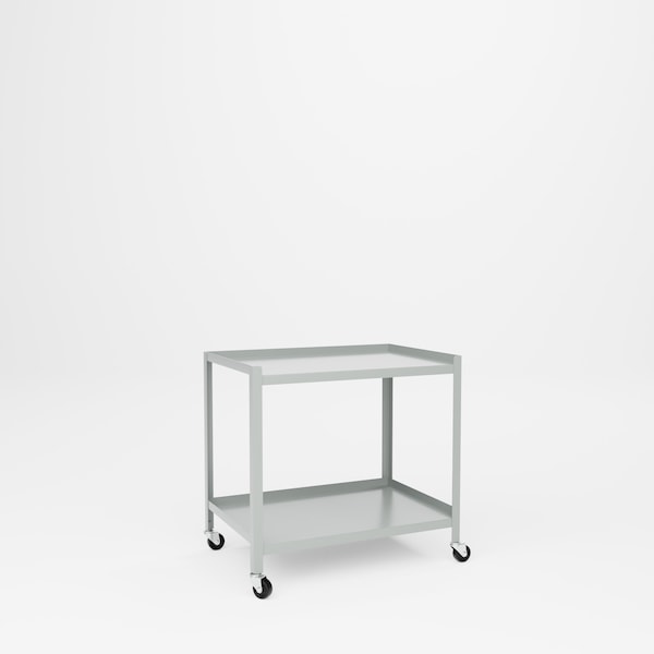 All welded steel, Heavy Duty Utility Cart with 2 Shelves. Includes back & side stops on shelves to prevent parts and other items from rolling off. 4-swivel 3in Casters. 36in W x 24in D x 34in H.Capacity 300 lbs. Powder Coat finish. GRAY.
