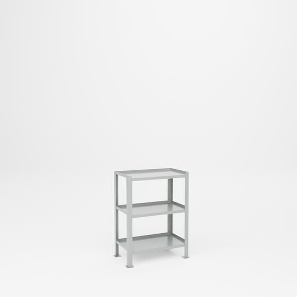 All welded steel, Heavy Duty Utility Table with 3 Shelves. Includes back & side stops on shelves to prevent parts and other items from rolling off, and floor pads. 23in W x 13in D x 31in H.Capacity 750 lbs. Powder Coat finish. GRAY.