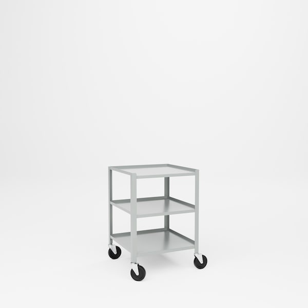 All welded steel, Heavy Duty Utility Cart with 3 Shelves. Includes back & side stops on shelves to prevent parts and other items from rolling off. 4-swivel 5in Casters. 24in W x 23in D x 34in H.Capacity 300 lbs. Powder Coat finish. GRAY.