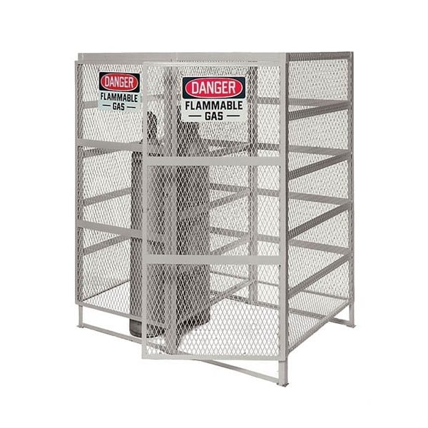 All welded expanded metal steel, Vertical Gas Cylin Der Cabinet. 30in Wide x 72in High x 38in Deep. 8 Cylin Der capacity. Stores flammables, LP gas cylin Ders for plant safety. Expanded metal open air design, protects cylin Ders. Hinged lockable doors prevent tampering and theft. Complete with safety signs. Powder Coat finish. GRAY..
