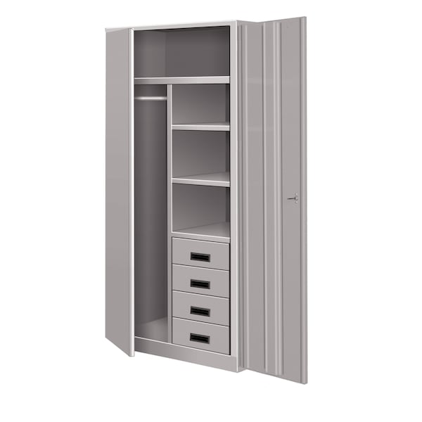 All welded steel, Extra heavy duty Wardrobe Storage Cabinet. Includes keyed handle, a top shelf, coat rod, 4-drawer unit with recessed handles (100 lbs. capacity per drawer), and 3 shelves. 60in Wide x 72in High x 24in Deep. Powder Coat finish. GRAY..