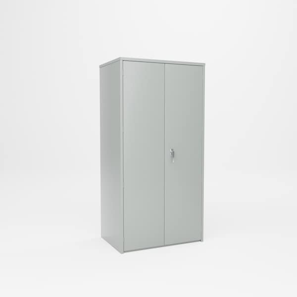 All welded steel, Extra heavy duty Wardrobe Storage Cabinet. Includes keyed handle, a top shelf, coat rod, 3 drawers with recessed handles (250 lbs. capacity per drawer) , and 3 half fixed shelves. 36in Wide x 72in High x 24in Deep. Powder Coat finish. GRAY..