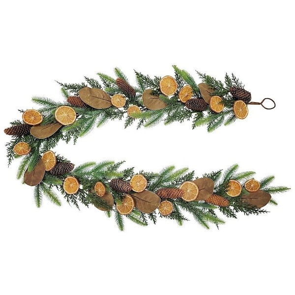 Classic Fall Garland with 63 tips, pinecones, orange slices and leaves. Wrapped construction. Size: 6 ft x 10 in.
