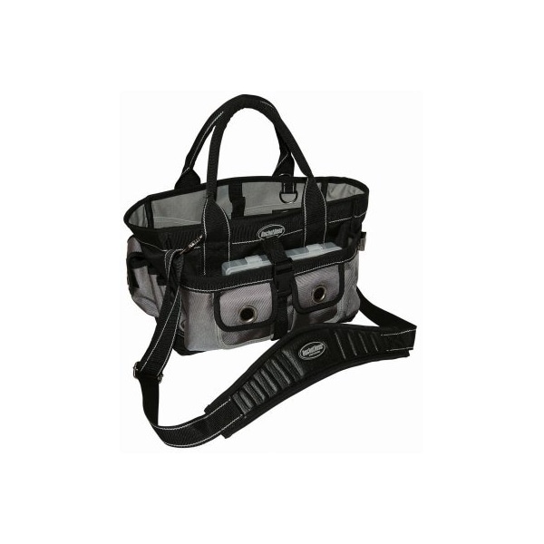 Bucket Boss, 14W x 9D x 9H, Extreme Hop Along Tote, Made Of Heavyweight 1680 Poly Material, Open Tote With Diamond Pac Reinforced Bottom, Includes Plastic Small Parts Tray, Padded Shoulder Strap, Dimensions
