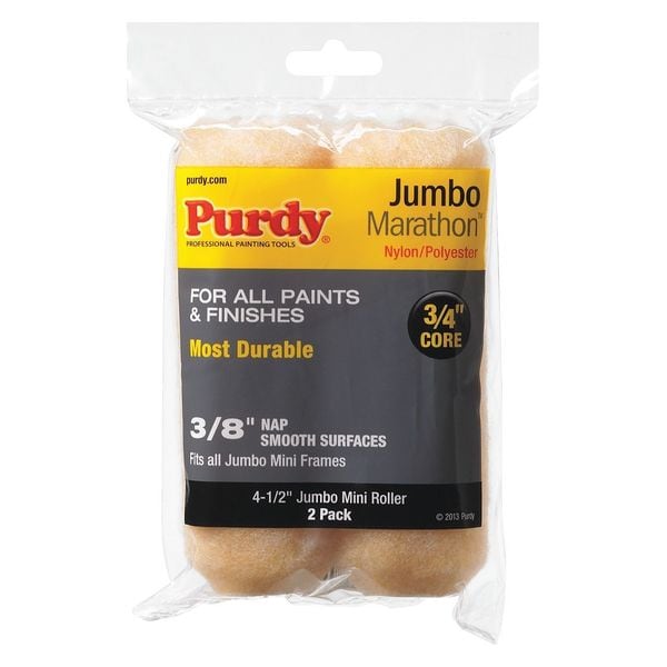 Paint Roller Cover, Cover Type Standard, Surface Texture Semi-Smooth, Smooth, Compatible Roller Frame Style Cage, 4 1/2 in Overall Length, 3/8 in Nap Size, Surface Material Concrete, Drywall, Masonry, Wood, Paint Type Oil Based Paints, Water Based Paints, Core Diameter 1/2 in, Cover Material Nylon, Polyester, Core Material Polypropylene, Sheen Type Eggshell, Flat, Satin, Package Quantity 2