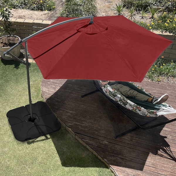 Keep your guests comfortable while creating a beautiful outdoor space with the stylish red 10-Foot Offset Patio Umbrella by Pure Garden. This large outdoor umbrella positions perfectly over various kinds of furniture and patio decor while opening and closing in seconds to provide comfortable shade whenever you need it. A durable powder-coated aluminum pole, steel ribs, and a sturdy square base ensure this shade umbrella handles the heat and rain, providing exceptional value over the years.IMPORTANT: Pure Garden is committed to providing the consumer with the absolute best price and value on our entire line of products. NOTE: This is an exclusive product of Pure Garden and ONLY Outdoor Umbrellas With Bases Included by Pure Garden are GUARANTEED to be genuine. Avoid buying counterfeit products and transacting with unauthorized sellers.