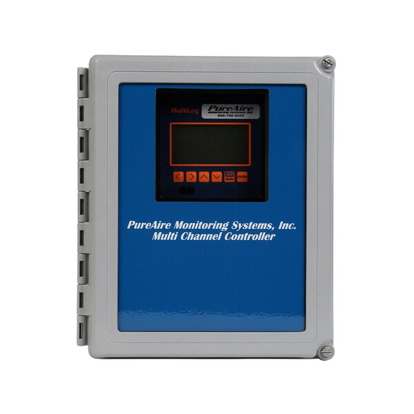 PureAire's 8 channel controller is designed to provide simple analog control or full featured digital control of toxic, LEL and oxygen deficiency monitors. The controller remotely powers and operates up to 8 monitors up to 100 feet from the controller. Capable of accepting any two or three wire gas detector, it features two user-adjustable common alarm relays which will, in the event of a gas leak, or a fault from one of the monitors, alert personnel. The multichannel controller incorporates various modes of operation for taking channels offline individually for performing calibration or sensor maintenance. Each channel can be individually designated with PPM, PPB or %. The LCD screen displays the readings from all 8 channels simultaneously, and the trends from each channel may be viewed in graph form over a period of time.