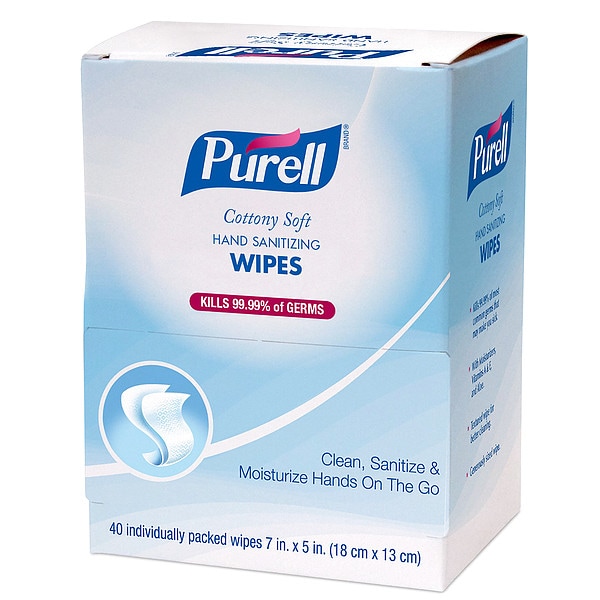 Hand Sanitizer Wipes, Container Type Packet, Flushable No, Form Wipes, Formula Alcohol, Fragrance Alcohol, Hygiene Properties None, NSF Rating Not Rated, Series Cottony Soft, Standards FDA, Wipe Length 7 in, Wipe Width 5 in, Wipes per Container 40, Material Cotton, Product Type Hand Sanitizer Wipes, Color White, Requires Dispenser No, Grainger Dispenser Part Number Not Applicable, Manufacturer Dispenser Part Number Not Applicable