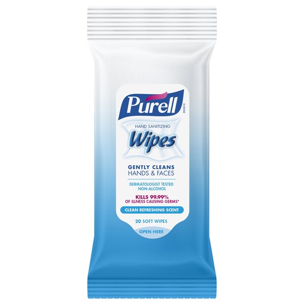Purell Hand Sanitizing Wipes Flow Pack (9124-28-CMR). Help your family and those you care for kill germs on their hands with PURELL Hand Sanitizing Wipes. Purell hand sanitizing wipes are proven to kill 99.99 percent of most common germs that may cause illness without damaging skin. These pre-moistened wipes are soft textured and durable to gently clean up hands or faces. They are also dermatologist tested and can be used when soap and water are not available. The 20-count travel pack fits just about anywhere making it convenient to take with you throughout the day while you are on-the-go. Purell hand sanitizing wipes are formulated to be gentle on skin containing no harsh chemicals. It is free of harsh preservatives and does not contain dye triclosan parabens or phthalates. Case includes 28 packs of 20 count Purell Hand Sanitizing Wipes..