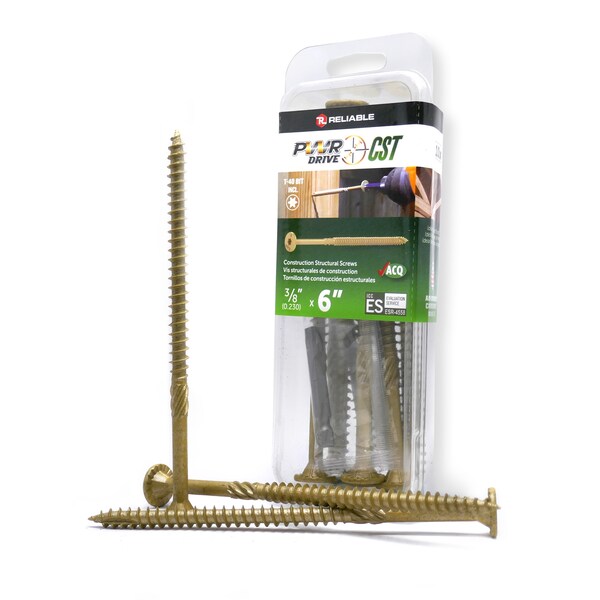 The PWR DRIVE CST screw is made of hardened steel to provide a degree of high tensile strength, high torque, and super shear strength that a regular lag screw just cannot offer. This gives an instant advantage of not having to pre-drill, which is quite a time saver on the job site. The sharp threads and points bite quickly, a type 17 tip reduces wood splitting and a clearing thread, called the U thread, reduces the friction on the screw shank, for reduced driving torque and more importantly increased battery life for your tools. The PWR DRIVE CST has a wide flat head with nibs and under-head cutting serrations for easy countersinks and will embed in wood with an incomparable clean finish. This screw also has a T-40 firm-grip drive provides exceptional torque strength and allows the CST to stick to the bit, which is paramount when working in tight spaces. The PWR DRIVE CST is part of the ICC/ESR-4558 evaluation, which certifies CST as fully compliant with the International Building Code IBC and the International Residential Code IRC, for both its structural properties and corrosion resistance. This is why all CST have head markings for easy job site inspections.