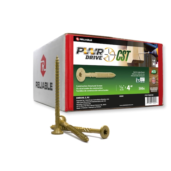 The PWR DRIVE CST screw is made of hardened steel to provide a degree of high tensile strength, high torque, and super shear strength that a regular lag screw just cannot offer. This gives an instant advantage of not having to pre-drill, which is quite a time saver on the job site. The sharp threads and points bite quickly, a type 17 tip reduces wood splitting and a clearing thread, called the U thread, reduces the friction on the screw shank, for reduced driving torque and more importantly increased battery life for your tools. The PWR DRIVE CST has a wide flat head with nibs and under-head cutting serrations for easy countersinks and will embed in wood with an incomparable clean finish. This screw also has a T-40 firm-grip drive provides exceptional torque strength and allows the CST to stick to the bit, which is paramount when working in tight spaces. The PWR DRIVE CST is part of the ICC/ESR-4558 evaluation, which certifies CST as fully compliant with the International Building Code IBC and the International Residential Code IRC, for both its structural properties and corrosion resistance. This is why all CST have head markings for easy job site inspections.