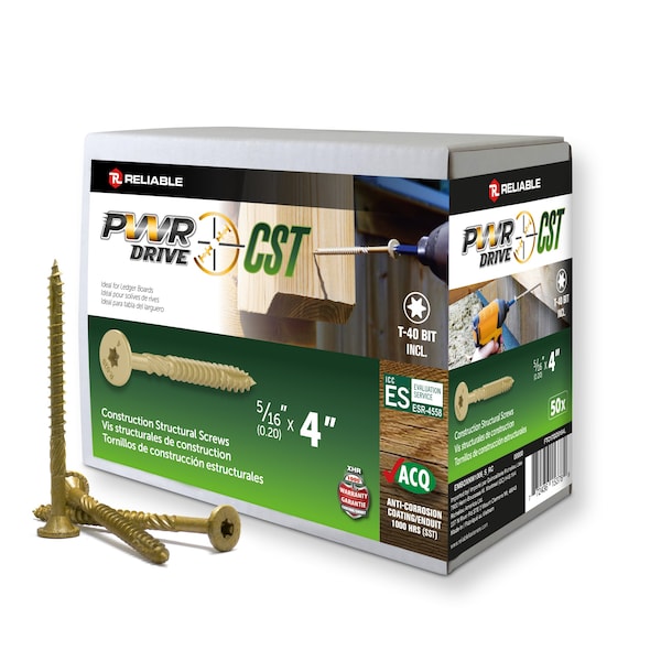 The PWR DRIVE CST screw is made of hardened steel to provide a degree of high tensile strength, high torque, and super shear strength that a regular lag screw just cannot offer. This gives an instant advantage of not having to pre-drill, which is quite a time saver on the job site. The sharp threads and points bite quickly, a type 17 tip reduces wood splitting and a clearing thread, called the U thread, reduces the friction on the screw shank, for reduced driving torque and more importantly increased battery life for your tools. The PWR DRIVE CST has a wide flat head with nibs and under-head cutting serrations for easy countersinks and will embed in wood with an incomparable clean finish. This screw also has a T-40 firm-grip drive provides exceptional torque strength and allows the CST to stick to the bit, which is paramount when working in tight spaces. The PWR DRIVE CST is part of the ICC/ESR-4558 evaluation, which certifies CST as fully compliant with the International Building Code IBC and the International Residential Code IRC, for both its structural properties and corrosion resistance. This is why all CST have head markings for easy job site inspections.