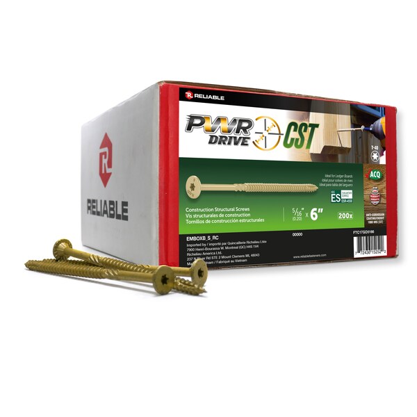 The PWR DRIVE CST screw is made of hardened steel to provide a degree of high tensile strength, high torque, and super shear strength that a regular lag screw just cannot offer. This gives an instant advantage of not having to pre-drill, which is quite a time saver on the job site. The sharp threads and points bite quickly, a type 17 tip reduces wood splitting and a clearing thread, called the U thread, reduces the friction on the screw shank, for reduced driving torque and more importantly increased battery life for your tools. The PWR DRIVE CST has a wide flat head with nibs and under-head cutting serrations for easy countersinks and will embed in wood with an incomparable clean finish. This screw also has a T-40 firm-grip drive provides exceptional torque strength and allows the CST to stick to the bit, which is paramount when working in tight spaces. The PWR DRIVE CST is part of the ICC/ESR-4558 evaluation, which certifies CST as fully compliant with the International Building Code IBC and the International Residential Code IRC, for both its structural properties and corrosion resistance. This is why all CST have head markings for easy job site inspections.