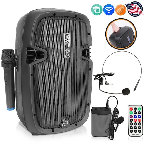 Features: - Versatile High-Powered Mobile Cabinet Speaker System - Rugged, Durable & Reliable Sound - Bluetooth Wireless Music Streaming Ability - Speaker System: 10'' Woofer, 1'' Tweeter - Compression Driver with Titanium Diaphragm - Built-in Rechargeable Battery - 2-Way Full Range Audio Projection - Built-in Digital Audio Amplifier - RCA (L/R) Stereo Line Input Connectors - RCA (L/R) Stereo Line Output Connectors - Connect & Stream Audio from External Devices - USB Flash Drive & SD Memory Card Readers - USB Reader Doubles as Device Charging Port - FM Radio with Digital LCD Display - ID3 Tag Song Readout Info: LCD Displays Song Title/Song Artist - Rear Panel Rotary Dial & Button Control Center - Master Volume, Mic Volume, Echo, Treble, Bass Setting - (2) 1/4'' Microphone Inputs - Convenient Carry Handles - 35mm Speaker Stand Mount - Engineered Heavy Duty ABS Housing Bluetooth Wireless Streaming: - Instantly Stream Music from Your Bluetooth Devices - Works with All Your Favorite Bluetooth Devices - (iPhone, Android, Smartphone, iPad, Tablet, PC, etc.) - Bluetooth Version: 4.0 - Wireless Range: 100'+ Feet - Bluetooth Network Name: 'Pyle' What's in the Box: - PA Speaker - Wireless Handheld Microphone - Headset Microphone - Beltpack Transmitter - Remote Control - Power Cable - (4) x “AA” Batteries Technical Specs: - Power Output: 600 Watt - Amplifier Class: D - Impedance: 4 Ohm - T.H.D.: 250mV - Frequency Response: 100-18kHz - Digital Audio File Compatibility: MP3, WMA - Maximum SD/USB Flash Memory Support: 32GB - Mic & Beltpack Battery Operated: Requires 2 x ‘AA’ Batteries (Each) - Power Supply: 120-240V - Dimension (L x W x H): 14.8'' x 12.4'' x 21.7'' -inches