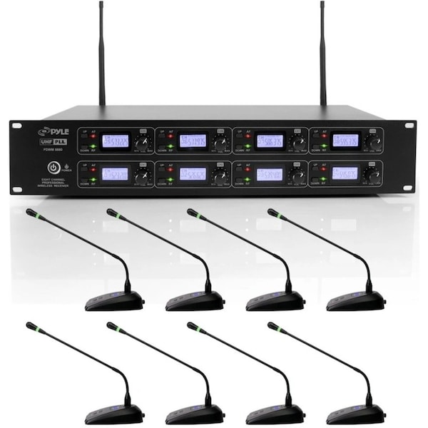 Features: - Professional UHF Conference Microphone System - Desktop, Tabletop Office Microphone Style - Includes (8) Tabletop Goosenecks Mics - Multi-Channel Selectable Frequency Setting - Hassle-Free Audio Operation - Simple Electric Plug-in Design - Independent Channel Volume Adjustment - Extended Wireless Operating Range - Mobile Anti-Interference Cartridge - Low Distortion Condenser Mics - LED Audio Signal Indicator Lights - Used for Home, Office, School & Business Applications What’s In The Box: - Microphone Receiver Base - (8) Wireless Conference Table Mics - (16) ‘AA’ Batteries - Foam Mic Windscreens - Removable Receiver Antennas - Audio Connection Cable - Power Adapter Microphone Receiver Base: - Front Panel Receiver Audio Control Panel - Digital LCD Display with Channel & Frequency Readout - Independent Channel Volume Adjustment - (8) XLR (3-Pin) Balanced Output Connectors - (2) 1/4’’ -inch Mixed Output Jacks - Power ON / OFF Switch - Rack-Mountable System Compatibility - AF (Audio Frequency) & RF (Radio Frequency) Indicators - Total Receiver Size (L x W x H): 18.9'' x 7.8'' x 3.9'' -inches Gooseneck Microphone Transmitters: - Universal Desktop Conference Meeting Mics - Digital LCD Display with Frequency Readout - Adjustable Transmitter Volume Control - Convenient Flexible Gooseneck Positioning - Battery Level Indicators - Mute Button Function - Battery Operated Table Mics, Require (2) x ‘AA’ Batteries Each, Included - Total Gooseneck Mic Size (L x W x H): 6.85'' x 4.45'' x 1.91'' -inches (Each) Technical Specs: - Microphone Receiver Type: 8-Channel - Desktop Mic Type: Tabletop Gooseneck, Condenser - Audio Signal Transmission: UHF (Ultra High Frequency) Band - Wireless Operating Range: Up to 165’+ ft. - Oscillation: PLL Synthesized - T.H.D.: 70 dB - Rack Mount Size: 2U, Standard - Power Cable Length: 3.28’ ft. - Power Supply: 120/240V (13-15V Power Adapter) - Receiver Base Size (L x W x H): 18.9'' x 8.8'' x 3.8'' –inches