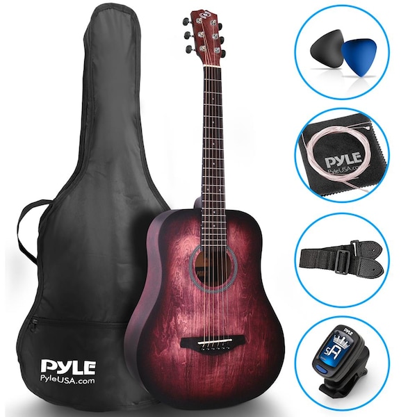 Features: - Matt Finish - All Linden Plywood Top, Back and Side - High-Density Man-made Wood Fingerboard and Bridge - Hand Rubbed Finish on Body, Neck, and Headstock - Quality Die-cast Machine Head - 34"Size Acoustic Guitar - Acoustic / Traditional Body Style - Red Burst Pattern Guitar Design - Adjustable Treble, Mid & Bass Controls - Diecast Chrome Tuning Machine Head Pegs What's in the Box: - 6-String Acoustic Guitar - Travel / Storage Gig Bag - (6) Spare Guitar Strings - Detachable Shoulder Strap - Pitch Pipe Tuner - Cleaning Cloth - (2) Pearloid Picks Digital Guitar Tuner: - Convenient Clip-on Design - Tuning Range: A0 - C8 (27.5 - 4186 Hz) - Response Time: Technical Specs: - Total Guitar Length: 34'' -inches - Scale Length: 22.9'' -inches - Number of Picks: 2 pcs. - Felt Picks Dimension: 0.035’’ Thickness (0.9mm) - Headstock Material: Okoume - Fretboard/Fingerboard Material: High-Density Man-made Wood - Rosette Style: Decal - String Material: Steel - Number of Frets: 20 Frets - Guitar Body Material: All linden plywood top, back and side - Guitar String Material: Steel Alloy - Total Guitar Dimensions (L x W x H): 34.0'' x 13'' x 3.6'' -inches
