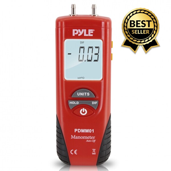 11 Selectable Units of Measure (in H2O, Psi, Mbar, Bar, kPa, inHg, mmHg, Ozin2, ftH2O, cmH2O, KgCm) - Display Max, Min, Average, with Relative Time - Large LCD Backlit Dual Display - Zeroing, Offset, and Data Compensation - Low Battery Display and Automatic Shutdown - Data Hold and Error Code - Accuracy: +/- 0.3% FSO (25o C) - Repeatability: +/- 0.2% (Max +/- 0.5% FSO) - Linearity/Hysteresis: +/- 0.29% FSO - Maximum Pressure: 10 PSI - Response Time: 0.5 Sec. - Power Supply: 9V Battery (Included) - 2 Soft Hoses Included - Dimensions: 6.69'' H x 2.17'' W x 1.30'' D - Weight: 5.82 oz.