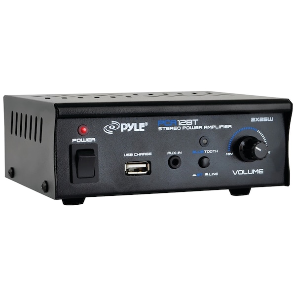 The Pyle Home PCA12BT Mini Blue Series Bluetooth Stereo Power Amp provides up to 25 watts to each of its 2 channels. Built-in Bluetooth technology allows you to instantly stream audio from your favorite devices quickly and easily. Connect external devices using the auxiliary stereo input connector. It's compatible with virtually any audio or computerized device.