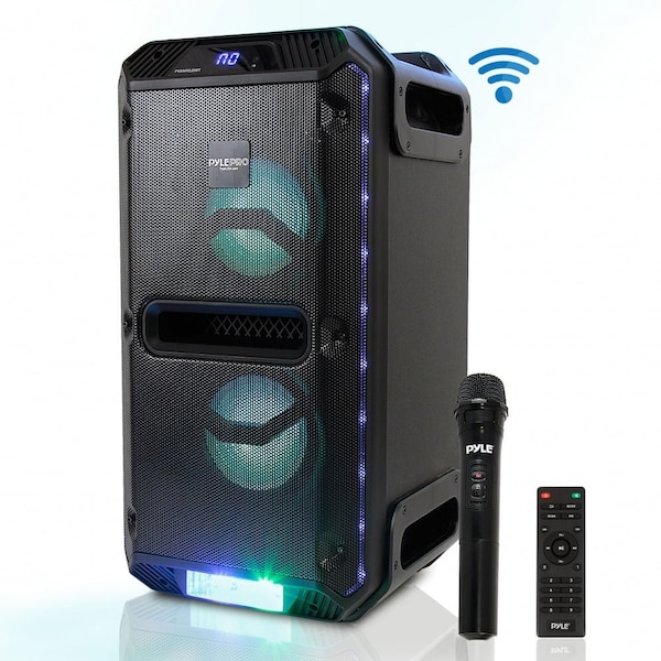 Features: - Karaoke & Music Streaming Speaker System - Compact, Portable & Powerful Sound - Bluetooth Wireless Audio Streaming - Built-in Rechargeable Battery - Flashing DJ Party Lights Pulse & Dance to the Beat - Create Your Own Soundtrack with Music + Vocals - Includes Handheld Wireless Microphone - MP3 Digital Audio File Playback via USB / Micro SD Readers - Audio File Recording Function - Top Panel Button Control Center - FM Radio with Digital LCD Display - Audio File Recording Function - Headphone Jack, 3.5mm - Aux (3.5mm) Input - (2) 1/4’’ -inch Microphone Inputs - Connect & Stream From External Devices - Full Range Stereo Sound Reproduction - Impressive Bass Response - Convenient Carry Handle - Rugged & Heavy Duty Design Bluetooth Connectivity: - Built-in Bluetooth for Wireless Streaming - Simple & Hassle-Free Pairing - Works with All of Today’s Latest Devices - (Smartphone, Tablet, Laptop, Computer, etc.) - Bluetooth Version: 2.0 - Bluetooth Network Name: 'PyleUSA’ - Bluetooth Password: '0000' (4 Zeroes) - Wireless Range: 65'+ ft. Audio Recording: - It's Easy: One Button Recording Activation - Record Audio as Streamed through the Speaker System - Ability to Record Vocals via Microphone - Records to USB Flash or Micro SD Card - Audio File Type Created: .MP3 - Easy Transfer to PC & Mac What's in the Box: - Portable PA Speaker - Wireless Microphone - Remote Control - AUX Audio Cable - Power Adaptor Technical Specs: - Power Output: 500 Watt MAX - Impedance: 4 Ohm - Frequency Response: 100-20kHz - Sound Distortion: <1.0% - S/N Ratio: 80dB - Max USB/SD Memory Card Support: 32GB - Digital Audio File Compatibility: MP3 - Rechargeable Battery: 11.1V Polymer, 4000mAh 44.4Wh - Power: 100/240V (DC 12V Power Adapter)