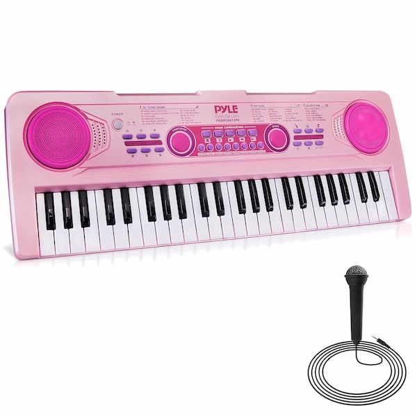 Features: - 2-in-1 Karaoke Keyboard: Play & Sing-Along! - Includes Wired Handheld Microphone - Smart Piano Teaching Function with Piano Key Lighting - Compact & Portable Musical Piano - Simple Electronic Plug-in Operation - Portable Piano, Built-in Rechargeable Battery - Integrated Button Drum Pad - Built-in Full Range Stereo Speakers - Connect & Stream Audio from External Devices - Works with Smartphones, Tablets, Laptops, Computers - Multiple Preset Selectable Keyboard Sound, Tone & Rhythm Styles - Adjustable Volume Control - Record & Playback Mode - Auto Power Off, Power Saving Function - Perfect for Home Theater Living Room Performances - Fun for Kids of All Ages: Children & Adults - Cute Pink Color with Fun Animal Sounds Whats in the Box: - Portable Piano Keyboard - Wired Microphone - USB Charge Power Cable - Audio Cable Technical Specs: - (49) Keyboard Keys - (100) Preset Selectable Tunes - (100) Preset Selectable Audio Rhythms - (50) Preset Selectable Demos - Audio Interface: Aux (3.5mm) Input Jack / Mic Input - Max Sound Level: Up to 98 dB - USB/Power Cable Length: 3.9’ ft. - Construction Material: Engineered ABS - Built-in Rechargeable Battery: 3.7V Li-iOn - Battery Type: Li-ion Battery - Battery Life: 300times= about 2400hours - Battery Weight: 36.5g - Charging Time: 4 hours - Power Supply: 110/240V (DC 5V) - Piano Dimensions (L x W x H): 20.8’’ x 7.0’’x 2.1’’ -inches