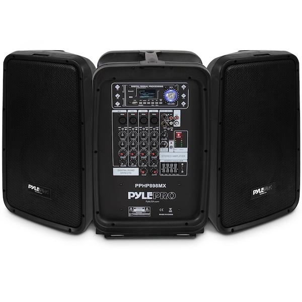 System Features: - All-in-One DJ Audio Loud-Speaker Kit - 8-Channel Powered Amplifier Audio Mixer - Dual Molded Cabinet PA Speakers - Sound System: (2) x 8'' Subwoofers, (2) x 1’’ Piezo Horn Tweeters - Rugged, Durable & Reliable Sound - Bluetooth Wireless Music Streaming Ability - Compression Drivers with Titanium Diaphragms - 2-Way Full Range Audio Projection - Built-in Digital Audio Amplifier - Independent Channel Audio Configuration Settings - Audio Mixer Console Button Control Center - 5-Band Graphic EQ Control - +48V Phantom Power Switch - USB Flash Drive Memory Reader - ID3 Tag Song Readout Info: LCD Displays Song Title/Song Artist - Connect & Stream Audio from External Devices - XLR (3-Pin) Connectors - 1/4’’ (6.35mm) Input - RCA (L/R) Stereo Line Input/Output Jacks - Heavy Duty Engineered ABS Housing - Convenient System Design Assembles & Disassembles for Quick Setup - Perfect for On-Stage Performances, Crowd Control, Public Gathering Events Bluetooth Wireless Streaming: - Instantly Stream Music from Your Bluetooth Devices - Works with All Your Favorite Bluetooth Devices - (iPhone, Android, Smartphone, iPad, Tablet, PC, etc.) - Bluetooth Version: 4.0 - Bluetooth Network Name: ‘BLUE’ - Wireless Range: Up to 30'+ ft. What's in the Box: - (2) 8’’ PA Speakers - Audio Mixer Console - Speaker Connection Cables (1/4’’) - Power Cable Technical Specs: - Power Output: 600 Watt MAX - Speaker Style: Molded Cabinet - Magnet: 20 Oz - Voice Coils: 1.0’’ -inch - Amplifier Class: D - Impedance: 4 Ohm (x2) - T.H.D.: 250mV - Frequency Response: 40-18kHz - Digital Audio File Compatibility: MP3, WMA - Maximum SD/USB Flash Memory Support: 32GB - Remote Battery: Requires (1) x ‘CR20-25’ Button Cell, Included - Power: 110/220V - Unit Dimensions (L x W x H): 27.4’’ x 12.8’’ x 23.8’’ -inches