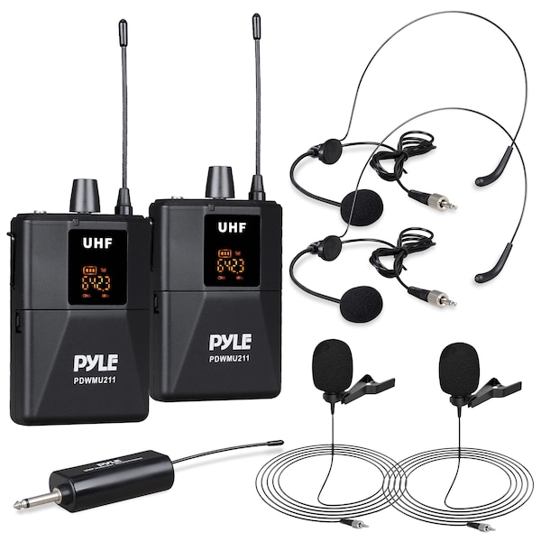 Pyle Dual UHF Microphone System - Wireless Cordless Set, 2 Handheld & Lavalier Mics, Receiver