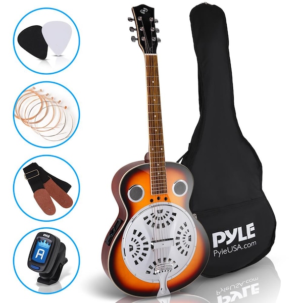 Features: - Standard Full-Size Guitar - Traditional Resonator / Resophonic Style - Dual Circular Guitar Body Sound Holes - Hand-Crafted Wooden Construction - Natural Sunburst Body Design - Built-in Preamplifier - Includes White ABS Binding - High Gloss Polished Deep Cherry Stained Body & Back - Diecast Chrome Tuning Machine Head Pegs What's in the Box: - Resonator Guitar - Travel / Storage Guitar Gig Bag - (6) Spare Guitar Strings - (3) ABS Picks - Detachable Nylon Shoulder Strap - Digital Tuner Technical Specs: - Total Guitar Length: 39.8'' inches - Scale Length: 24.8'' inches - Total Body Length: 18.9'' inches - Total Neck Length: 14'' inches - Headstock Material: Okoume - Fretboard/Fingerboard Material: Walnut - Guitar Body Material: Spruce & Mahogany Plywood with White ABS Binding - Guitar String Material: Bronze Wound, Steel Core - Number of Frets: 21 Frets - Total Guitar Dimensions (L x W x H): 39.8” x 15.2'' x 3.8'' -inches