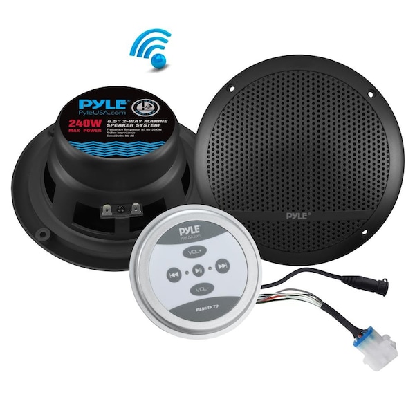 System Features: - Universal Mountable Speaker & Amplifier Kit - Perfect for Custom Mobile/Vehicle Applications - Marine Grade Style & Water Resistant Design - Includes All Necessary Cables & Wires for Installation - Bluetooth Wireless Music Streaming Ability - Aux (3.5mm) Input Connector Jack - Connect & Stream Audio from External Devices - Simple Digital Touch Button Controls - LED Connection Indicator Lights Bluetooth Wireless Connectivity: - Simple Connection & Device Pairing - Built-in Bluetooth for Wireless Audio Streaming - Works with All of Today’s Latest Devices - (Smartphone, Tablet, Laptop, Computer etc.) - Bluetooth Network Name: ‘PYLE PLMRKT9’ - Bluetooth Version: 3.0 - Wireless Range: 30'+ Feet What’s in the Box: - (2) 6.5’’ Marine Speakers - Wired Bluetooth Controller with Built-in Amplifier Amplifier Specs: - 2-Ch. Amplifier Design - RMS Power: 2 x 60 Watt at 4 Ohm - MAX Power: 2 x 120 Watt at 4 Ohm - Waterproof Housing Construction - Marine Grade Rating: IP-X5 - Built-in Electronic Crossover Network - T.H.D: 95dB - Channel Separation: >65dB - Frequency Response: 20Hz- 25kHz - Fuse : 5A - Power: DC 12V - Amp Dimensions (L x W x H): 4.2'' x 4.2'' x 2.3'' - Amp Cut-Out Diameter: 3.1’’, Cut-Out Depth: 1.49’’ - Amp Weight: 0.48 lbs. Marine Speakers Specs: - (2) 6.5'' Reinforced Polypropylene Cones - Full Range Stereo Sound Reproduction - 2-Way Speaker Design - Weather-Resistant Grill Design - Marine Grade Rating: IP-X5 - 0.5'' PEI Dome Tweeters - Suspension Cloth Surround - 120 Watts RMS / 240 Watts Peak - Frequency Response: 83-20KHz - Impedance: 4 Ohms - Total Speaker Dimensions (L x W x H): 7.09’’ x 7.09’’ x 3.46’’ - Speaker Cut-Out Diameter: 5.2’’, Cut-Out Depth: 2.4’’