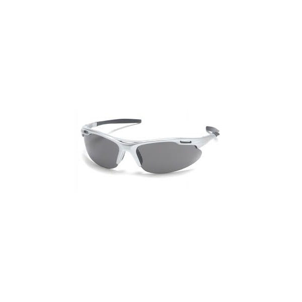 Pyramex Avante Safety Glasses , Vented Type , Gray Lens Color , Polycarbonate Lens Material , Scratch Resistant Lens Coating , Silver Frame Color , Polycarbonate Frame Material , 99% UV , Straight Back Temple Style , Non Adjustable Temple Adjustment , ANSI Z87.1 -2010 Standards , 8 Curved Base , 2.4 MM Lens Thickness , 26.9 Gram Weight