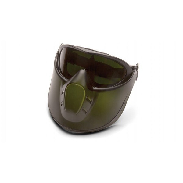 Pyramex Safety - Capstone - Direct/Indirect Goggle with IR5 Lens and Green Tinted Faceshield Attachment - Capstone goggle incorporated with removable shield provides full face protection. The shield with ratchet allows user to open or close in 3 positions for adjustment; 4 ventilation holes provide appropriate airflow. The polycaronate shield conforms to the face offering increased impact and dust protection. Indirect-vent frame provides protection against splash and dust. Soft vinyl goggle body conforms to facial contours for a very comfortable fit. High Impact resistance against flying particles. Fits over prescription glasses. Fully adjustable elastic band. Includes 2 disposable tear off visors, which can be replaced as they become dirty or scratched.