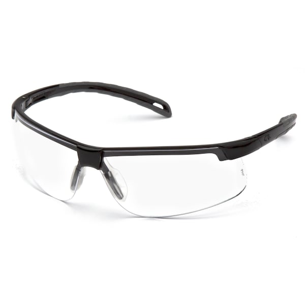 Pyramex Safety - Ever-Lite - Black Frame/Clear Lens - Soft nose piece for snug fit. Semi-frame & slim co-material temple design for lightweight spectacle – 22 gm. Optical class 1 lens offers the clearest and the most panoramic view without obstruction. 8 base wraparound lens provides full front & side protection. Scratch-resistant, polycarbonate lens provide polycarbonate lens provide 99.9% of UV protection.